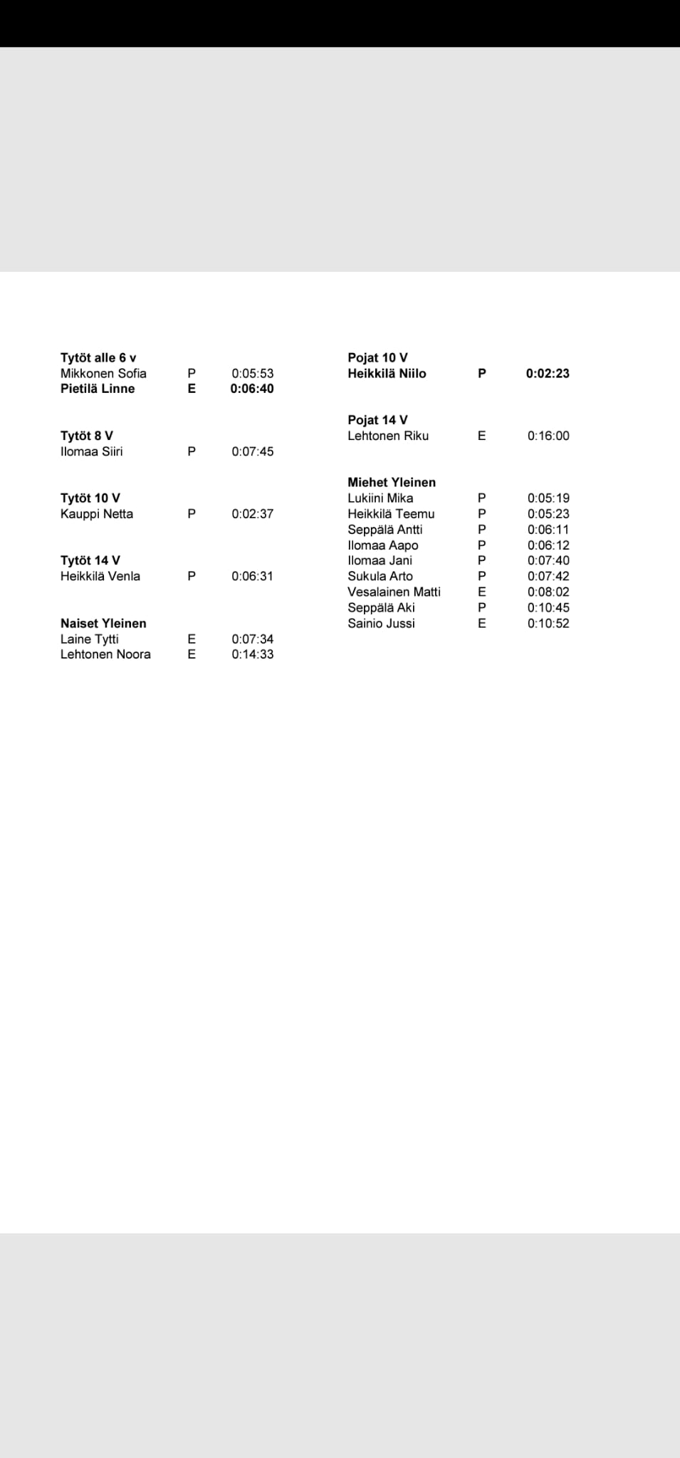 Palkinnot: alle 6v sarjasta kaikki, muut sarjat 3 parasta sekä nuorin tyttö ja nuorin poika sekä vanhin nainen ja mies